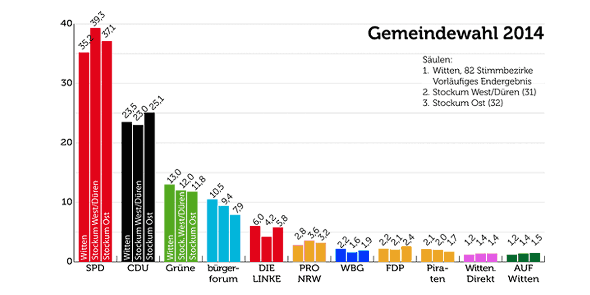 Wahlen 2014: Die SPD legt zu, drei neue Parteien kommen in den RatWitten-Stockum. Elf Parteien standen bei der Gemeinderatswahl in Witten auf dem Stimmzettel, alle ziehen ins Rathaus ein. Trotz der großen…